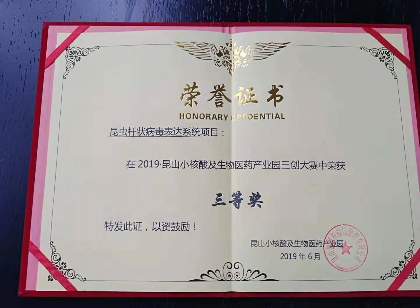 2019年6月25日,2019?昆山小核酸及生物醫(yī)藥產(chǎn)業(yè)園三創(chuàng)大賽落下帷幕。本次大賽共征集來(lái)自中國(guó)、美國(guó)、新加坡、以色列等地各類(lèi)項(xiàng)目近60個(gè)。經(jīng)過(guò)層層選拔,“昆蟲(chóng)桿狀病毒表達(dá)系統(tǒng)項(xiàng)目”最終榮獲三等獎(jiǎng)。昆山市發(fā)展改革委副主任萬(wàn)繼民、昆山陽(yáng)澄湖科技園管委會(huì)副主任奚國(guó)鋒等領(lǐng)導(dǎo)出席了大賽。