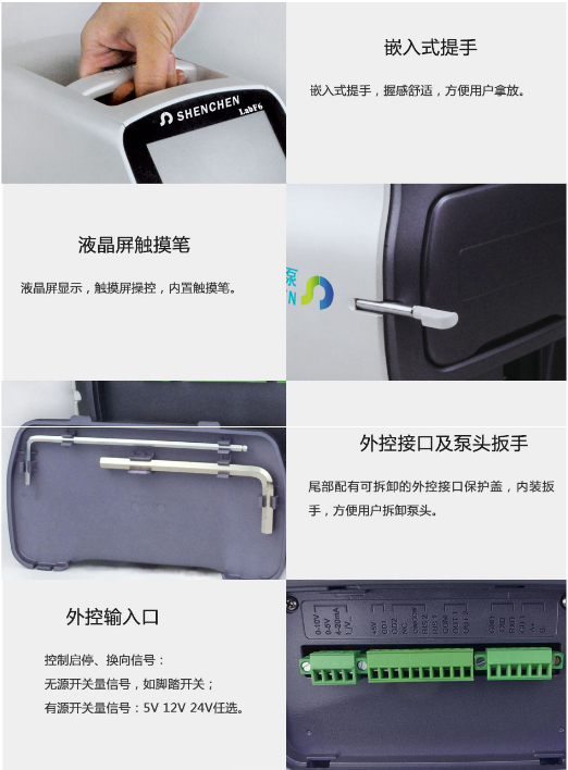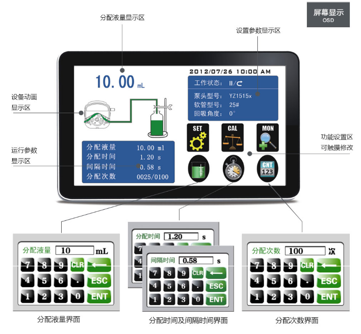 智能分配型工業(yè)蠕動(dòng)泵,采用ABS工程塑料外殼,加噴UV涂層,實(shí)現(xiàn)防腐蝕,防靜電保護(hù)。流線型機(jī)身設(shè)計(jì),工業(yè)級4.3英寸真彩色顯示,觸摸屏操作,轉(zhuǎn)速范圍1-600轉(zhuǎn)/分鐘,流量范圍0.00166-2280ml/min,可預(yù)設(shè)分配流量,分配時(shí)間,間隔時(shí)間,分配次數(shù),回吸角度,動(dòng)畫顯示工作狀態(tài),分配數(shù)據(jù),設(shè)定參數(shù),系統(tǒng)配置同屏顯示??蛇B接腳踏開關(guān)或開關(guān)信號,實(shí)現(xiàn)遠(yuǎn)程控制,適用于大流量、高效率、高精度灌裝。