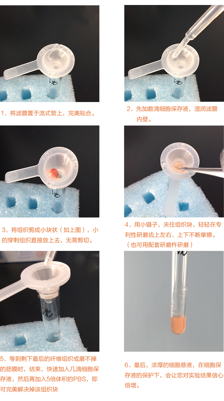 為了解決上述難題,我們推薦使用下面這款單細胞懸液快速制備利器,這種一次性標本過濾和研磨多面手,與流式管緊密貼合,內(nèi)置200目尼龍濾網(wǎng),設(shè)計有便利手柄,便于固定操作,濾器內(nèi)壁設(shè)計有專利性特殊研磨齒,研磨組織且對組織損傷小,配合細胞保存液,實現(xiàn)極高的細胞得率和活性。利用單細胞懸液快速制備利器,既可進行實體組織輕松研磨,又可進行常規(guī)的骨髓、外周血、體液、組織等標本上機前的過濾操作,防止堵塞機器。一舉多得,價格還特便宜。